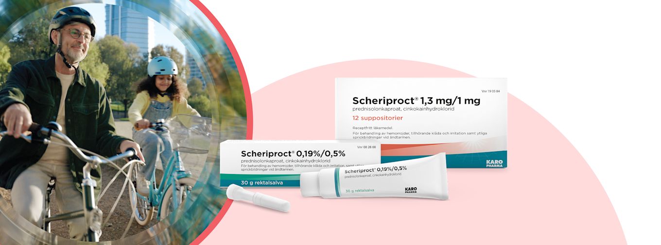 Scheriproct salva innehåller en dubbelverkande formel för snabb lindring av hemorrojder. Använd den för att bli av med klåda, smärta, svullnad, rodnad, ömhet och andra besvärande symptom runt anus som orsakas av yttre och inre hemorrojder och ytliga analfissurer. Scheriproct suppositorier lindrar inflammation, klåda, svullnad, smärta, ömhet och andra analbesvär. Hemorrojder suppositorier rekommenderas ofta av läkare eftersom de lätt och effektivt absorberas av ändtarmen och utgör ett bra komplement till salvan. De medicinska suppositorierna innehåller en kombination av ingredienser som snabbt lindrar smärta och inflammation orsakad av hemorrojder i ändtarmen.
